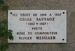 Cécile Anne Marie Antoinette Sauvage (French pronunciation: [sesil an maʁi ɑ̃twanɛt sovaʒ]; 20 July 1883 – 26 August 1927) was a French poet. She was the author of collections Tandis que la terre tourne (1910) and Le Vallon (1913). Her love poetry was posthumously collected and published by Béatrice Marchal in the volume Cécile Sauvage: Écrits d'amour (2009). Sauvage was the mother of French composer Olivier Messiaen.