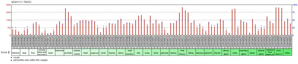 The gene has shown high expression in the prostate, thymus, appendix, bone marrow, and lungs. NCBI AceView shows that the gene is moderately expressed.[3]