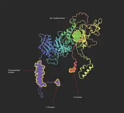 The most complete sequence produces a protein that is 788 amino acids long. The protein features a zinc binding domain motif, and 5 N-linked glycosylation sites.[10] Additionally computational analysis predicted six Myristoylation sites, three sumoylation sites,[11] and one Propionylation site. The CIROP protein is found on the cell membrane with a type 1A transmembrane morphology which can be seen in figure 4 with the N-terminus being extracellular and the c-terminus being cytosolic.[12]
