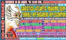 | 4 | Atlantis and Brazo de Plata defeated Dragón Lee, Máximo Sexy, Rey Escorpión, Titán, Carístico and The Panther | Torneo Nacional de Parejas Increíbles 2016 seeding battle royal |