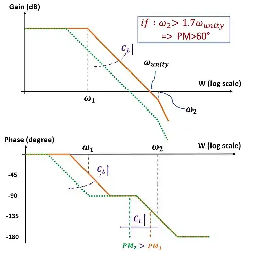 In many applications, an amplifier drives a capacitor as a load. In some applications, like switched capacitor circuits, the value of capacitive load changes in different cycles. Therefore, it affects output node time constant and amplifier frequency response. Stable behavior of amplifier for all possible capacitive loads is necessary, and designer must consider this issue during designing of circuit. Designer should ensure that phase margin (PM) of the circuit is enough for the worst case. To have proper circuit behavior and time response, designers usually consider a PM of 60 degrees. For higher PM values, the circuit is more stable, but it takes longer for the output voltage to reach its final value.[1][2][3] In telescopic and FC amplifiers, the dominant pole is at the output nodes. Also, there is a non-dominant pole at the cascode node.[3] Since capacitive load connected to output nodes, its value affects the location of the dominant pole. This figure shows how capacitive load affects the location of dominant pole and stability. Increasing capacitive load moves the dominant pole toward the origin, and since unity gain frequency is (amplifier gain) times it also moves toward the origin. Therefore, PM increases, which improves stability. So, if we ensure stability of a circuit for a minimum capacitive load, it remains stable for larger load values.[2][3] To achieve greater than 60 degrees PM, the non-dominant pole must be greater than