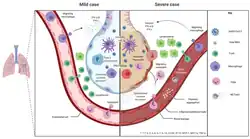 Systemic inflammation results in vasodilation, allowing inflammatory lymphocytic and monocytic infiltration of the lung and the heart. In particular, pathogenic GM-CSF-secreting T cells were shown to correlate with the recruitment of inflammatory IL-6-secreting monocytes and severe lung pathology in people with COVID‑19.[161] Lymphocytic infiltrates have also been reported at autopsy.[129]