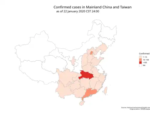 Confirmed cases in mainland China and Taiwan as of January 22, 2020, a day before Wuhan's lockdown. By the end of January 22, there were 571 confirmed cases across mainland China,[78] among which there were 444 confirmed cases in Hubei.[79]