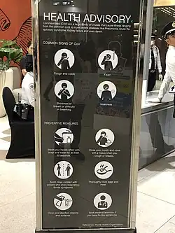 On April 1, the City of Manila reports its largest single-day increase in coronavirus infections so far with 41 new cases, bringing the city's total to 116.[45] In the same day, more than 800 Filipino repatriates from four virus-stricken cruise ships in the U.S. arrive at Ninoy Aquino International Airport.[46] The Inter-Agency Task Force on Emerging Infectious Diseases (IATF-EID) announced on April 2 that Metro Manila remains the worst hit by the coronavirus crisis in the country after 1,511 cases were confirmed in the region, or more than 50 percent of the total confirmed cases in the Philippines by that time.[47] COVID-19 inter-agency taskforce spokesman Karlo Nograles announces the mandatory wearing of face masks in public for residents in all regions under enhanced community quarantine in Luzon.[48] The Department of Health launches a 24/7 coronavirus hotline for Metro Manila residents.[49] On April 6, a ten-man medical team from China arrive in Manila to share their experience in prevention and control of the coronavirus disease,[50] while the Metro Manila Development Authority installed decontamination tents in all public hospitals and government offices across the region.[51] On April 3, the National Capital Region Police Office confirm its first COVID-19 casualty among its ranks.[52]
