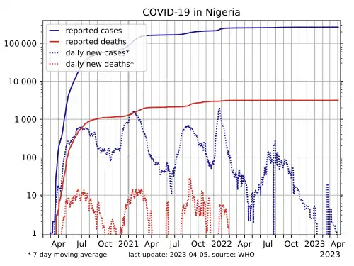 - ^ "Nigeria: WHO Coronavirus Disease (COVID-19) Dashboard With Vaccination Data". covid19.who.int. Retrieved 2 June 2023.