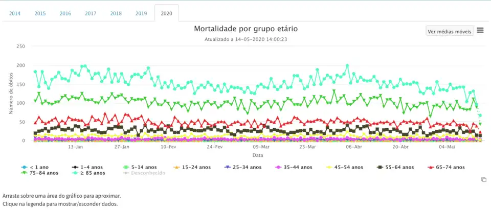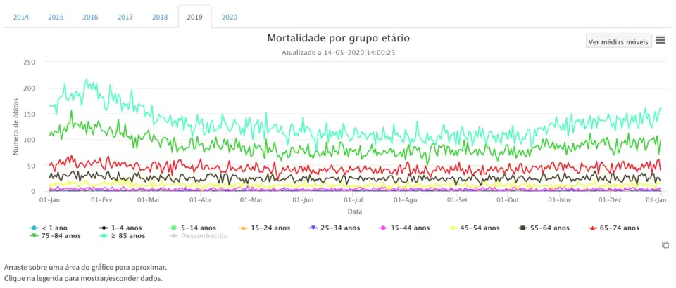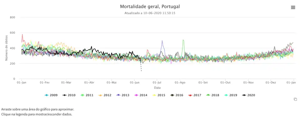 According to the Portuguese mortality surveillance (EVM[76]), the following chart presents the total number of deaths per day in Portugal for the years 2009–2020 (updated on 10 June).
