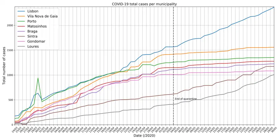 The following graph presents the total number of COVID-19 cases per day for the municipalities of Portugal with more than 1000 confirmed cases (updated on 30 May), according to the Data Science for Social Good Portugal.[75]