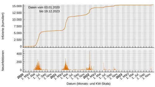 - There were 83 confirmed cases in 2023, bringing the total number of cases to 15,440. 585 patients recovered in 2023. The death toll remained unchanged. At the end of 2023 there were 127 active cases.[24]