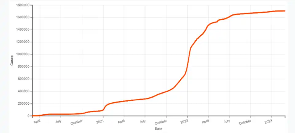 By 13 November 2023, the Department of Health had confirmed 1,725,026 cases and 9,366 deaths;[3] a rate of 342,416 cases per million (34.2% of the population), 1,866 deaths per million (0.19% of the population) and 2,606,161 tests per million population.[53]