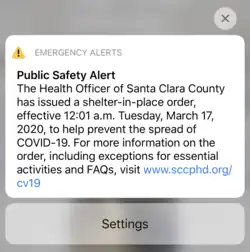 - March 16: The "Big Seven" public health departments issued a joint shelter-in-place order, legally requiring all non-essential businesses to close and residents to stay at home except for essential needs, effective March 17.[61] It was the first such order in the mainland United States, coming a day after Puerto Rico went into lockdown.[62][55]