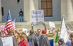 The following weekend, protests began on April 17, with dozens protesting outside the east side of the Statehouse.[72] The next day, April 18, the protests grew to hundreds.[73][72] Protesters carried signs with slogans lamenting the loss of liberties for the sake of safety, as well as signs critical of state officials,[73][72] and demanded that the state be immediately reopened.[73]