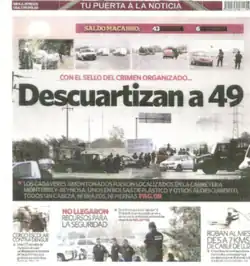 The Cadereyta Jiménez massacre occurred on the Fed 40 on 12–13 May 2012.[1] Mexican officials stated that 49 people were decapitated and mutilated by members of Los Zetas drug cartel and dumped by a roadside near the city of Cadereyta Jiménez in northern Mexico.[2][3] The Blog del Narco, a blog that documents events and people of the Mexican Drug War anonymously, reported that the actual (unofficial) death toll may be more than 68 people.[4] The bodies were found in the town of San Juan in the municipality of Cadereyta Jiménez, Nuevo León at about 4 a.m. on a non-toll highway leading to Reynosa, Tamaulipas.[5][6] The forty-three men and six women killed had their heads, feet, and hands cut off, making their identification difficult.[2] Those killed also bore signs of torture and were stuffed in plastic bags.[7] The arrested suspects have indicated that the victims were Gulf Cartel members,[8] but the Mexican authorities have not ruled out the possibility that they were U.S.-bound migrants.[9] Four days before this incident, 18 people were found decapitated and dismembered near Mexico's second largest city, Guadalajara.[10]