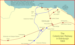 The Caledonian Railway entered Edinburgh on 15 February 1848 when it opened its Edinburgh line from Carstairs to a terminus at Lothian Road. A locomotive depot was established at Dalry Road. This completed the first continuous railway line between Edinburgh and England; trains from Edinburgh combined with trains from Glasgow at Carstairs, and ran to London in combination. The rival North British Railway had already opened southwards from Edinburgh but for the time being passengers had to change at Berwick-upon-Tweed to cross the River Tweed on foot. The Caledonian Railway also ran trains between Edinburgh and Glasgow, competing with the more direct Edinburgh and Glasgow Railway, and a period of ruinous competition began.[1][2][3]