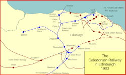 The Duke of Buccleuch owned and operated docks at Granton, on the north-west extremity of Edinburgh; the principal traffic was coastal shipping, as well as ferries to Fife ports.[2] The North British Railway served his docks, and he was anxious to have a connection from the Caledonian Railway. The Caledonian proposed a line from the Haymarket branch, diverging at Granton Junction and forking at Granton itself, serving both the west breakwater there and the main Granton Pier; Buccleuch contributed half of the construction cost. The line opened on 28 August 1861. Buccleuch's docks had extensive internal sidings, and the Caledonian and NBR lines did not directly connect; nonetheless Granton was extensively used for wagon exchange, which took place over part of the Granton Dock system. In 1863 the Caledonian Railway bought out Buccleuch's share of the line.