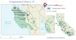 As of the 2022 United States House of Representatives elections, the 14th district is in Alameda County and includes the cities of Hayward, Pleasanton, Livermore, Union City, Castro Valley, and parts of Dublin and Fremont.[3] Immediately prior to that, the district included most of San Mateo County and the southwest side of San Francisco.