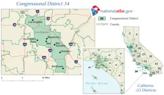 California's 34th congressional district is a U.S. congressional district in California. Located in Los Angeles County, the district is represented by Democrat Jimmy Gomez. Its previous U.S. representative, Democrat Xavier Becerra of Los Angeles, resigned January 24, 2017, to become attorney general of California. Representative Gomez won a special election on June 6, 2017, beating fellow Democrat Robert Lee Ahn to replace Becerra.[3] He was later sworn in as the district's U.S. representative on July 11, 2017.[4]