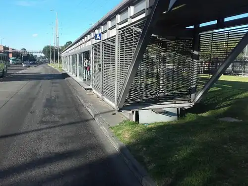 The simple station Calle 187 is part of the TransMilenio mass-transit system of Bogotá, Colombia, which opened in the year 2000.