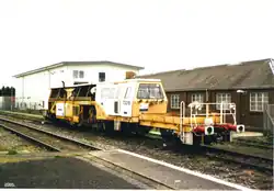 A picture of Carillion ballast/track tamper train at Banbury station in the mid-2000s (decade). The red brick work shed behind it is one of the surviving Britannia Works buildings.