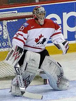 Once the lockout ended, Ward joined the Hurricanes for the 2005–06 NHL season and was expected to serve in a primarily backup role to veteran goaltender Martin Gerber. Ward unexpectedly made his NHL debut on October 5, 2005, after Gerber got injured mid-game. He saved 10 of 11 shots in the third period, as the Hurricanes lost 5–2 to the Tampa Bay Lightning.[67][68] He made his first NHL start the following game against the Pittsburgh Penguins and stopped all three shots in the shootout for his first NHL win.[69] As Gerber remained injured, Ward became the Hurricanes starting goaltender and maintained a 3–1–0 record, a 2.05 goals against average, and a .932 save percentage. His efforts earned him a place on Team Canada's long list for the 2006 Winter Olympic Games.[70] Once Gerber recovered from his injury, the Hurricanes began alternating between the two goaltenders.[71] However, Ward began to struggle through November and Gerber again took over as the Hurricanes starting goaltender.[72] By the start of December, Ward had only played in nine games and maintained a 3.67 goals against average.[73] After losing his next four games, Ward was re-assigned to the AHL on a conditioning stint on December 14.[74][75] Ward earned two stars over four days with Lowell, and stopped 54 of 59 total shots. He was called back to the NHL level on December 20 and participated in their practice the following day.[76] Ward made his first start for the Hurricanes in over a month on December 29 against the Ottawa Senators.[77] He slowly began to find success as the season continued and in January, helped the Hurricanes tie a franchise record for most consecutive home wins in a season.[78] While still splitting the starting role, Ward won his next five starts through the end of January and into early February. This gave him a 11-4–2 record and .341 goals against average.[79]