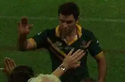 In April 2009, he was named in the preliminary 25 man squad to represent Queensland in the opening State of Origin match for 2009.[23] He was selected for Australia in the one-off test match against New Zealand on 8 May 2009.[24] In the preliminary final in which Melbourne defeated the Brisbane Broncos 40–10, he became Storm's highest ever point scorer, beating Matt Orford's record of 877. Smith led the Storm in their 2009 NRL Grand Final victory over the Parramatta Eels.[25] At the end of the season, he joined the Kangaroos on their campaign to win the 2009 Four Nations tournament in England. He scored the try that saved Australia from losing in the opening match and also scored in the Kangaroos' victory against England in the final.