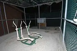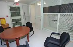 Camp Echo consists of separate one-story buildings, each a cell divided into two rooms by mesh grates. This division allows lawyers to consult with detainees in the area of their cells. Military officials also use the facilities to interrogate detainees, shackling them to the floor.[1] The eight feet by ten feet (2.4 m by 3 m) concrete buildings have narrow, slotted translucent plastic in the doors but no real windows; they are air-conditioned and heated. The cell side contains a toilet and a cot. The visitor side contains a table and chairs.[2]
