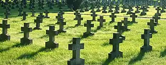Holy Cross Cemetery is reserved for members of the Congregation of Holy Cross, which founded the university. All burials are identical and composed by a simple stone cross with the name of the deceased and dates of birth and death. Burials include Rev. Edward Sorin, Rev. William Corby, Fr. John Zahm, and Rev. Theodore Hesburgh. All but one of Notre Dame's fourteen deceased presidents are buried in the community cemetery. The exception is Cardinal John O'Hara, CSC, the order's first cardinal, who is entombed inside the Basilica of the Sacred Heart on campus. Professor Joseph Lyons, namesake of Lyons Hall, was the first case of a layman being buried there.[14] In 1892, a monument was erected on his tomb, consisting of a granite obelisk with the words "Erected to his memory as a tribute of the affection of the old students." and "He was always the same-kind and gentle, sincere and self-sacrificing."[15] A statue of Our Lady of Sorrows by Robert Graham is found in the mausoleum.[16]