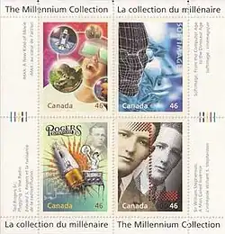 January's series of four Millennium souvenir sheets features, among others, Lester B. Pearson, Terry Fox and CIDA. These bold 112-by-108 mm souvenir sheets frame four 36-by-48 mm stamps in thematic groupings that celebrate Canadian giants in fields as diverse as medicine, finance, peacekeeping and international development.[6]