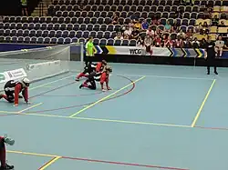![]() Eyeshades being checked at the game start, World Goalball Championships, Malmö, Sweden (2018). | |