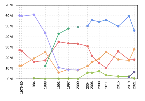 | Election | Liberal | Conservative | New Democratic | Green | People's | PC | Reform / Alliance |