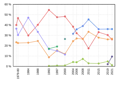 | Election | Liberal | Conservative | New Democratic | Green | People's | PC | Reform / Alliance |