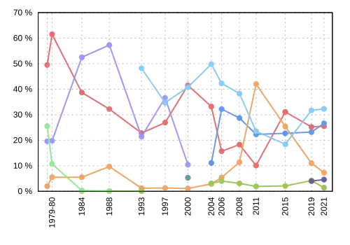| Election | Liberal | Conservative | New Democratic | Bloc Québécois | Green | PC | Reform / Alliance |