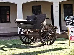 The Mle 1915 was a conventional design with a hydro-pneumatic recoil system mounted under the barrel, a gun shield to protect the crew and a box carriage with wooden wheels. It used an interrupted-screw breech with separate-loading ammunition; the shell being loaded first followed by the proper amount of propellant in a brass cartridge case. A loading tray was hinged to the left side of the cradle. It was swung into position after the breech had opened to hold the shell before it was pushed into the chamber, which had a catch to hold the shell in place until it could be rammed, but had to be moved out of the way before the breech could be closed for firing. It could be towed by a team of eight horses if a two-wheeled limber was placed under the trail and the barrel pulled back along the trail to move the center of gravity towards the limber. For (slow) motor-traction no limber was necessary and the trail was hooked directly to the tractor.[2]