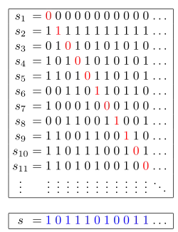 Next, a sequence s is constructed by choosing the 1st digit as complementary to the 1st digit of s1 (swapping 0s for 1s and vice versa), the 2nd digit as complementary to the 2nd digit of s2, the 3rd digit as complementary to the 3rd digit of s3, and generally for every n, the n-th digit as complementary to the n-th digit of sn. For the example above, this yields