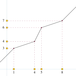 The same back-and-forth method used to prove Cantor's isomorphism theorem also proves that countable dense linear orders are highly symmetric. Their symmetries are called order automorphisms, and consist of order-preserving bijections from the whole linear order to itself. By the back-and-forth method, every countable dense linear order has order automorphisms that map any set of points to any other set of points. This can also be proven directly for the ordering on the rationals, by constructing a piecewise linear order automorphism with breakpoints at the given points. This equivalence of all -element sets of points is summarized by saying that the group of symmetries of a countable dense linear order is "highly homogeneous". However, there is no order automorphism that maps an ordered pair of points to its reverse, so these symmetries do not form a 2-transitive group.[1]