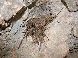 It builds a cup nest out of twigs and other vegetation in a rock crevice. It lays 4 to 6 eggs, white with reddish brown and gray speckles.