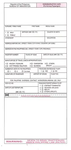 An old Philippine embarkation card (erroneously) warning visitors of the death penalty for drug trafficking after the abolition. The caveat has since been deleted in subsequent versions.