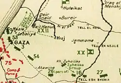 A second group of the retreating Gaza garrison had marched through the previous night, to gain distance and time to establish light field defences on a strong position just north of the Wadi el Hesi, seven miles (11 km) north north east of Gaza. In the sand dunes and in the cultivated area nearby, they constructed a series of short trenches. Behind these defences they resisted the EEF advance all day,[20][21][22][23] making a determined stand on the Wadi el Hesi.[24] It was towards this line held by the 7th Division, that the 53rd Division had withdrawn,[25] while the 3rd Division held Beit Hanun.[26]