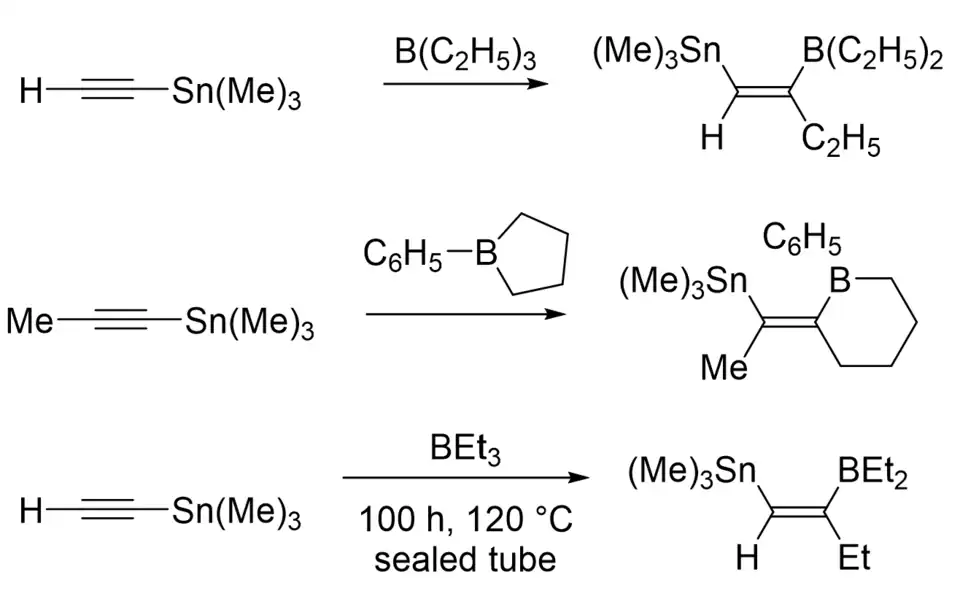 9. ^ Wrackmeyer, B.; Menz, G. (1977). "Organoborierung von Alkinylstannanen, III1 Zur Reaktion von Trialkylboranen mit Monoalkinylstannanen / Organoboration of Alkynylstannanes, III The Reaction of Trialkylboranes with Monoalkynylstannanes". Zeitschrift für Naturforschung B (in German). 32b (12): 1400. doi:10.1515/znb-1977-1209. S2CID 98409890.