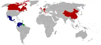 The Caribbean Development Bank was established by an agreement between sixteen members of the Commonwealth of Nations in the Caribbean region, along with Canada and the United Kingdom. Signed on October 18, 1969, in Kingston, Jamaica, the Agreement entered into force on January 26, 1970, when 15 of the 18 signing states ratified it.[4] The bank's initial capital was US$50 million, equivalent to 100 million Eastern Caribbean dollar, with main contributions from Jamaica (US$11,200,000 and 19.52% of votes), and the United Kingdom and Canada contributing US$10,000,000 each with 17.55% of votes in bank.[5]
