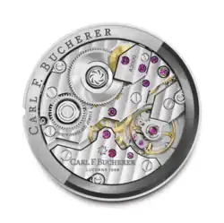 In 2018, Carl F. Bucherer launched its CFB T3000 manufacturer caliber, which implemented - in addition to the peripheral rotor - a tourbillon that appears to float. Unlike traditional tourbillons, it is neither mounted in the movement's main plate nor in an overlying bridge. Instead, the shockproof tourbillon cage actually sits securely in position, supported peripherally by three ceramic ball bearings. Distinctively non-visible, these bearings are said to ensure precise guidance and smooth operation. The tourbillon also has a stop-seconds function. The movement was first introduced in the Manero Tourbillon DoublePeripheral.[22][23]