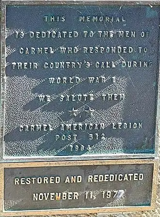 This Memorial Is Dedicated To The men Of Carmel Who Responded to Their Country's Call During World War I We salute them Carmel American Legion Post 512 1984 | |