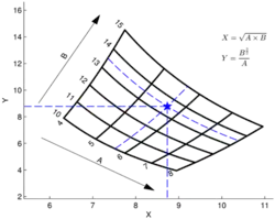 A carpet plot with two independent variables and one dependent variable is often called a cheater plot for the use of a phantom "cheater" axis instead of the horizontal axis. As a result of this missing axis, the values can be shifted horizontally such that the intersections line up vertically. This allows easy interpolation by having fixed horizontal intervals correspond to fixed intervals in both independent variables. The horizontal shift must sometimes be adjusted in order to eliminate or mitigate overlapping.[4] Depending on the data being depicted, eliminating overlapping is not always possible. The common solution is to split the plot into two carpets.