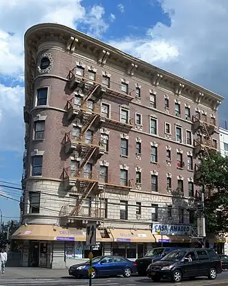Casa Amadeo is located in a historic apartment building located in the Longwood section of The Bronx, New York. Designed by James F. Meehan, the apartment building was built in 1905 and named The Manhaset. The building is a six-story, Neo-Renaissance style building with commercial storefronts on the first floor. The lower two stories are faced with rusticated stone and the upper floors in red brick. It features a projecting entrance porch flanked by Corinthian order columns.[2] The building is managed by local grassroots organization Banana Kelly, which has rehabilitated and maintained buildings in Longwood since the 1970s.[3][4]