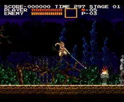Akumajō Dracula was designed to take full advantage of the X68000 hardware, featuring an updated and more complex game engine than the original Castlevania. This enhancement allowed for redesigned stages that included intricate and dynamic obstacles, as well as the addition of new, exclusive stages. One notable gameplay feature is the ability to attack enemies and obstacles diagonally from below.[6][7] The game retains all the special items and sub-weapons from the original, while introducing a new rare item called the herb, which can refill the player's health in exchange for hearts. Hidden items that grant points and 1-ups are scattered throughout the game and can be found by ducking or standing in specific locations.[7][6]