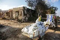 On 16 October 2023, UNRWA stated there were so many deaths in Gaza that there were no longer enough body bags.[139] Because the morgues were so overcrowded, bodies were kept in ice cream trucks.[140] On 11 November 2023, Monir al-Bashr, the director of the Health Ministry of Gaza, stated graves were being dug by hand.[141] On 12 November 2023, Mai al-Kaila noted staff at Al-Shifa were unable to bury 100 decomposing bodies.[142] On 14 November 2023, the Palestinian Red Crescent noted it was unable to rescue the wounded and injured beneath the rubble, noting, "Those injured are left there in agony to suffer and die with no response to their calls of help."[143] By August 2024, the dead were being buried in the streets and house yards, as well as in mass graves.[144][145]