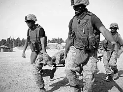 US Marines transport a non-ambulatory patient via litter, outside of Fallujah, Iraq in 2006