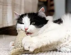 Object play for cats is the use of inanimate objects by the animal to express play behaviour.[3] In the case of pet domestic cats, humans normally provide them with purchased, human-made toys such as toy mice, bird or feather toys, or toy insects. These may be suspended from a string attached to a wooden or fishing-style rod designed to simulate lifelike activity in the toy, triggering the cat's predatory instincts – this game is known as catfishing.[4] Cat play can be enriched with the addition of obstacles behind which the prey can hide and items that make sound when the toy moves through them such as dried leaves, grass, or even a paper bag. When it comes to non-domestic, wild cats, they may use several objects in the wilderness as their toys including sticks, leaves, rocks, feathers, etc. Play behaviour includes throwing, chasing, biting, and capturing the toy object, mimicking behaviors used during an interaction with a real source of prey. Engaging in object play helps young cats practice these adult skills.[3]
