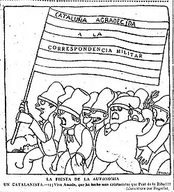 The mere possibility of the granting of a Statute of Autonomy for Catalonia provoked the immediate reaction of Spanish nationalism, which deployed a strong anti-Catalanist campaign based on clichés and stereotypes about Catalonia and the Catalans, but which managed to mobilize thousands of people who protested in Madrid and other cities.[15] The campaign was initiated by the so-called trust of the liberal press of Madrid formed by the newspapers El Liberal, El Heraldo de Madrid and El Imparcial, which was soon joined by the conservative daily ABC, the newspaper with the largest circulation in Spain. Various employers' organizations, some of them linked to the liberal sector headed by Santiago Alba, called for a large demonstration in Madrid, accompanied by the closure of stores, which brought together more than 100,000 people and had an enormous impact on public opinion —the newspaper El Imparcial headlined on its front page: "Madrid's protest against the separatism of the Catalans of the League"—. The campaign also included the boycott of Catalan products, as would happen in 1932 when the Cortes of the Second Spanish Republic debated the draft Statute of Autonomy of Catalonia.[24]