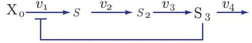 {\displaystyle X_{o}{\stackrel {v_{1}}{\longrightarrow }}S_{1}{\stackrel {v_{2}}{\longrightarrow }}X_{1}}