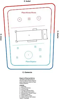 The cathedral sits in the center of Ponce's central square, Plaza Las Delicias, oriented east-to-west, with its front entrance facing west. Immediately behind the cathedral, to the east, is the historic fire house, Parque de Bombas. The two buildings effectively divide Plaza Las Delicias into two smaller plazas, named Plaza Muñoz Rivera and Plaza Degetau. Low undulating walls line the cathedral's northern and southern sides, and serve to separate it from the Plazas. Plaza Las Delicias is in barrio Segundo, one of the six core barrios of Ponce that compose Historic Zone designated by the Government of Puerto Rico to preserve the colonial character of the city.[13][14]